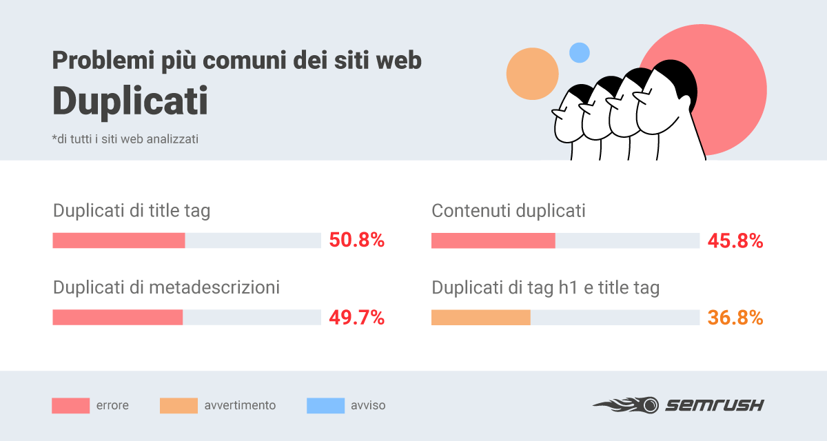 Come puoi vedere dai dati mostrati qui sopra, quasi la metà dei siti analizzati soffrono di problemi di indicizzazione causati da title tag, description e contenuti duplicati.